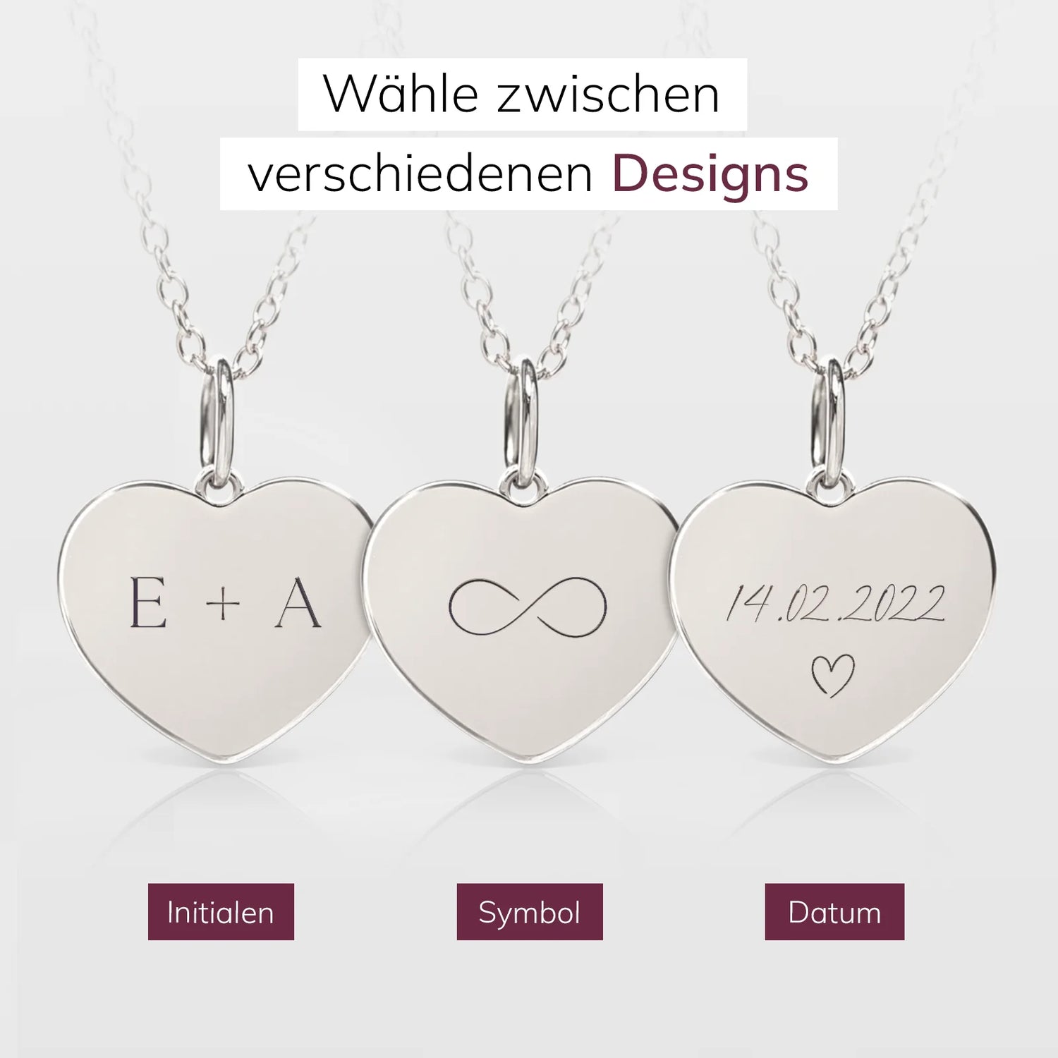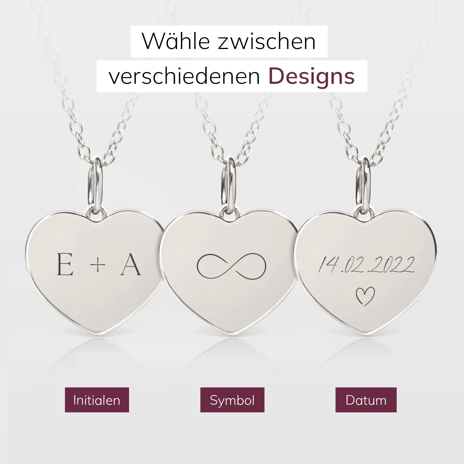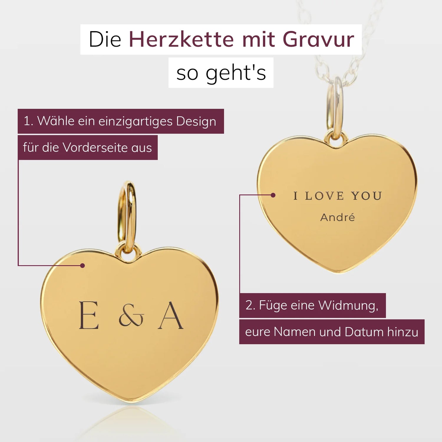 Entdecke die verschiedenen Gravur-Möglichkeiten und sieh, wie deine personalisierte Herzkette aussehen kann.