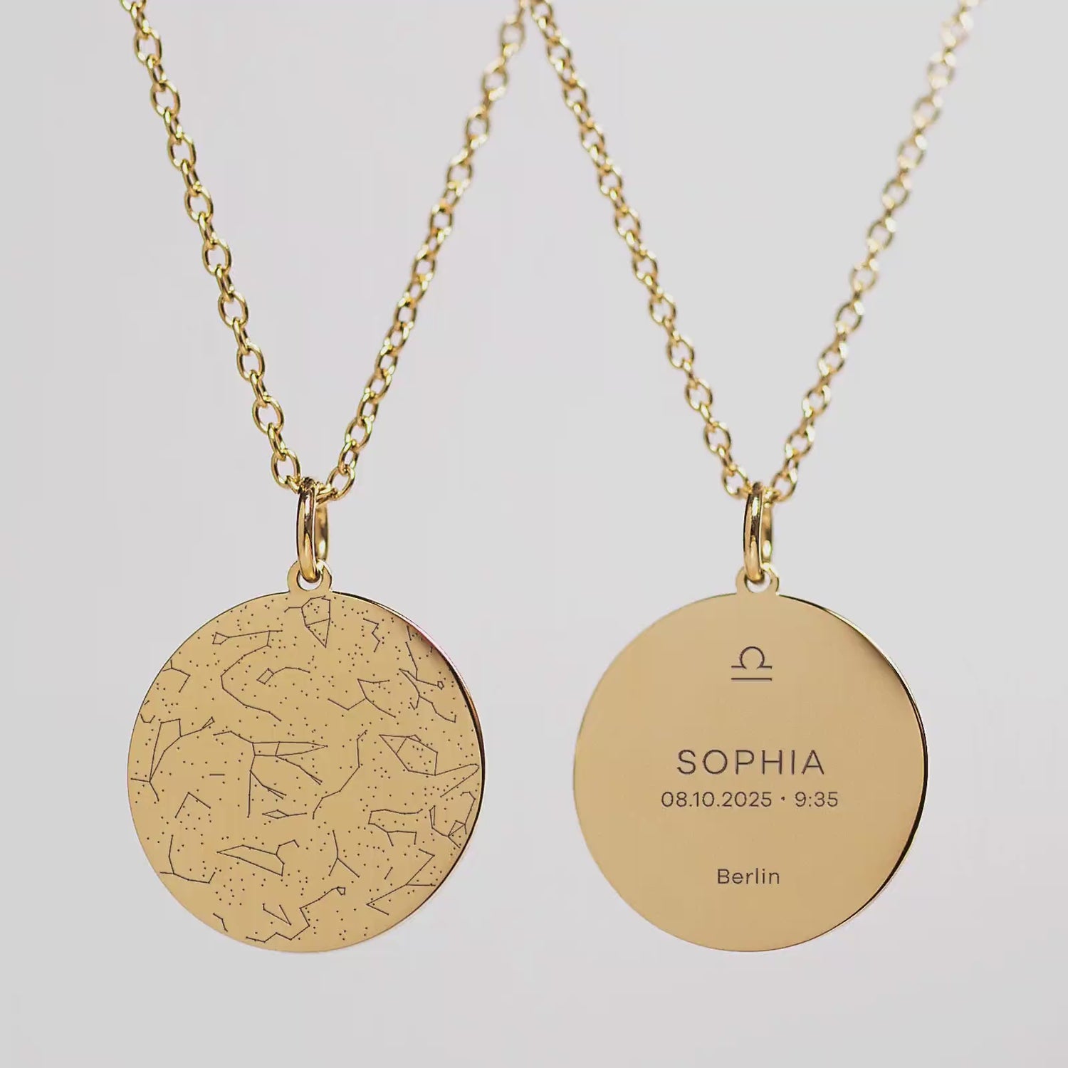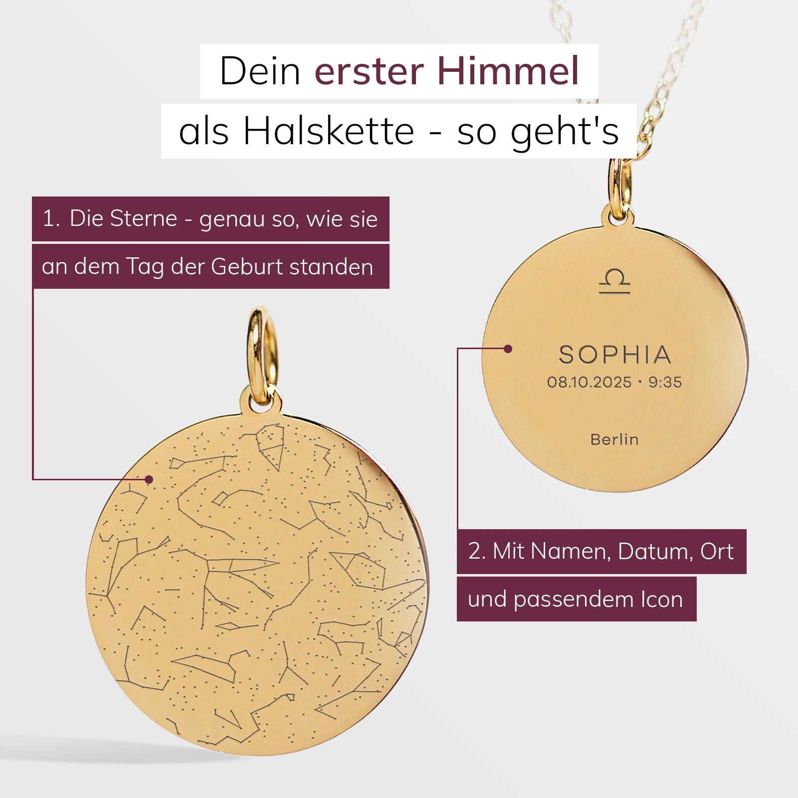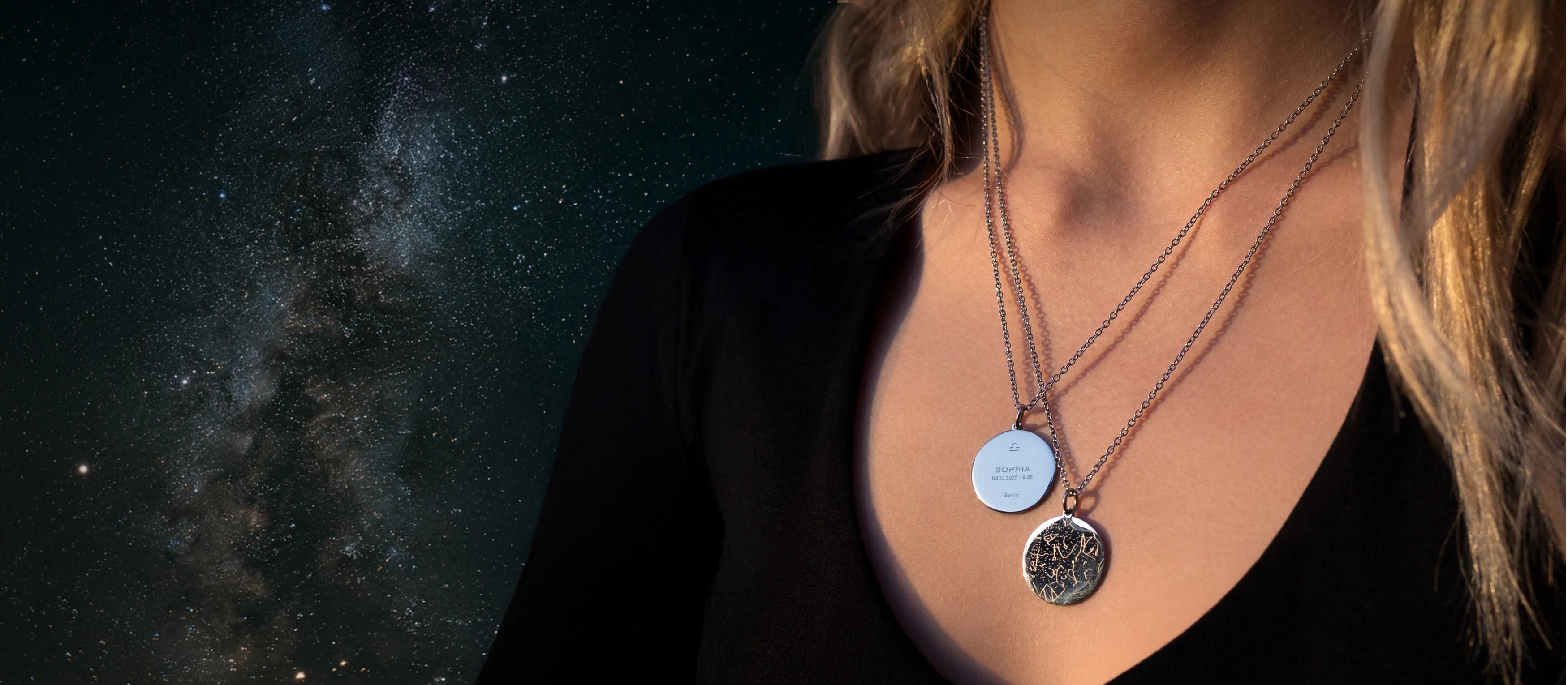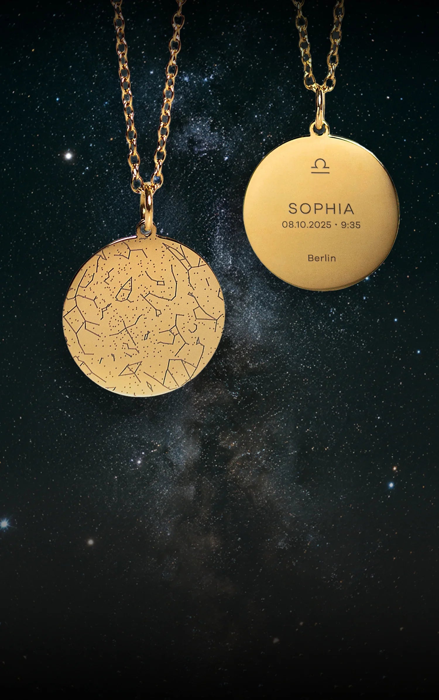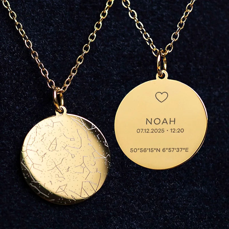 Der Himmel eines Sternmoments – verewigt in einer einzigartigen Halskette mit persönlicher Gravur von Namen, Datum, Ort und Sternzeichen.