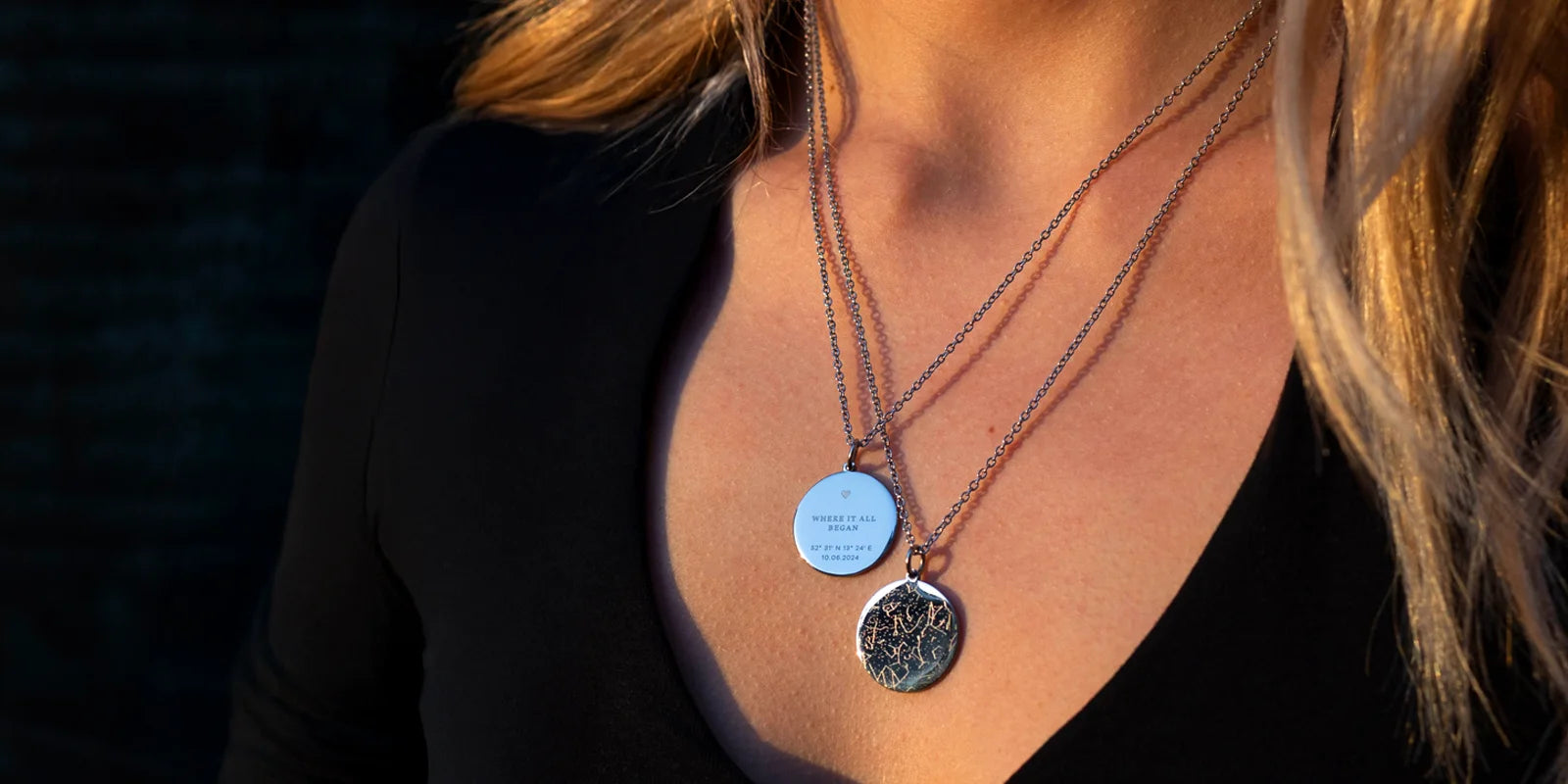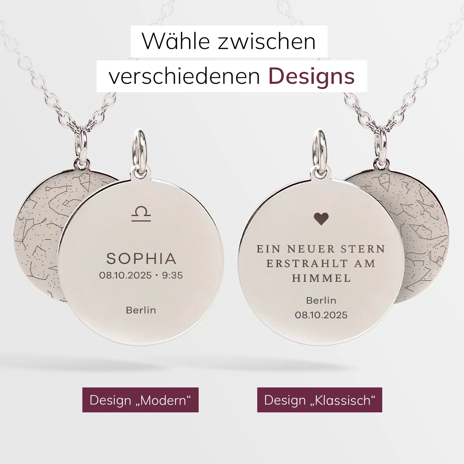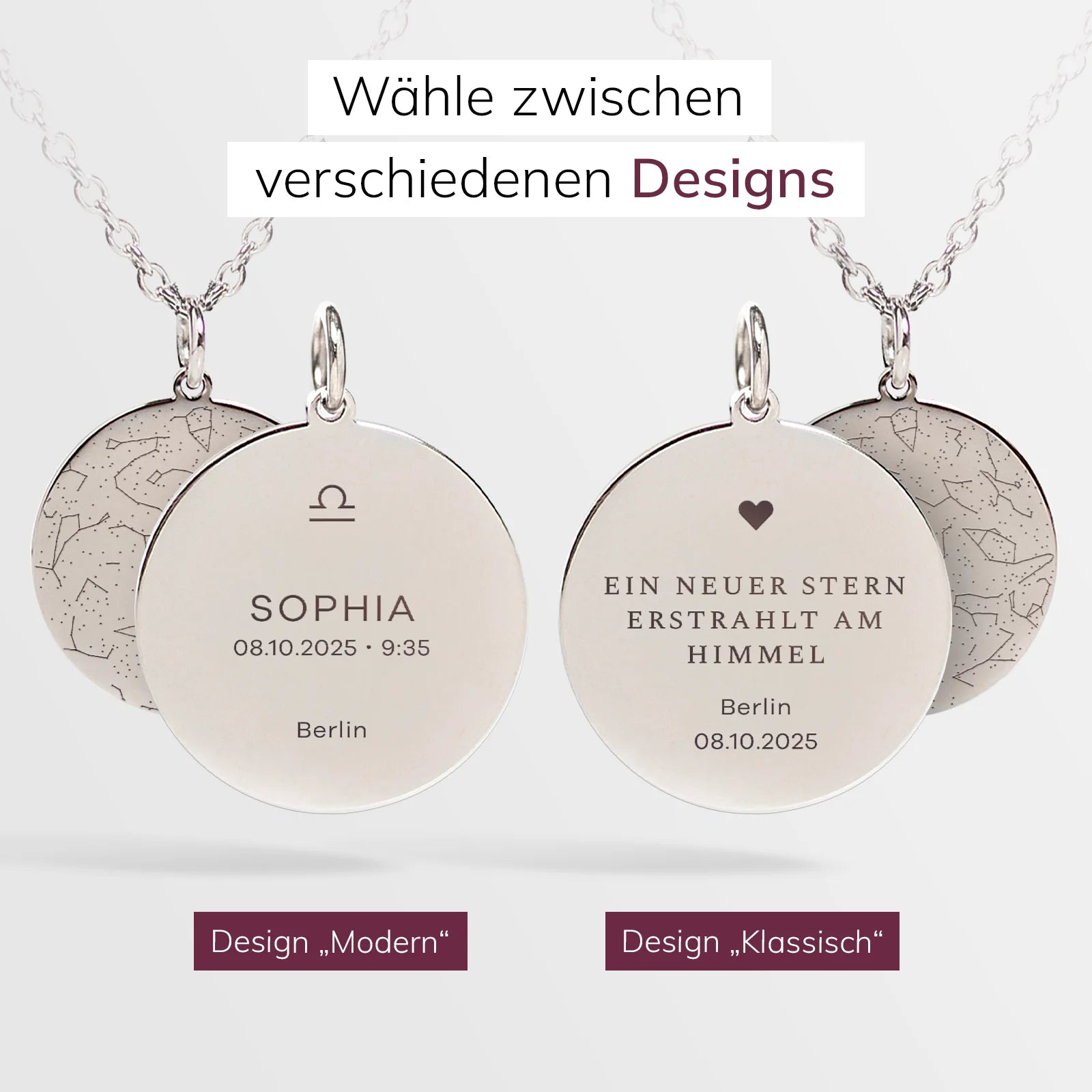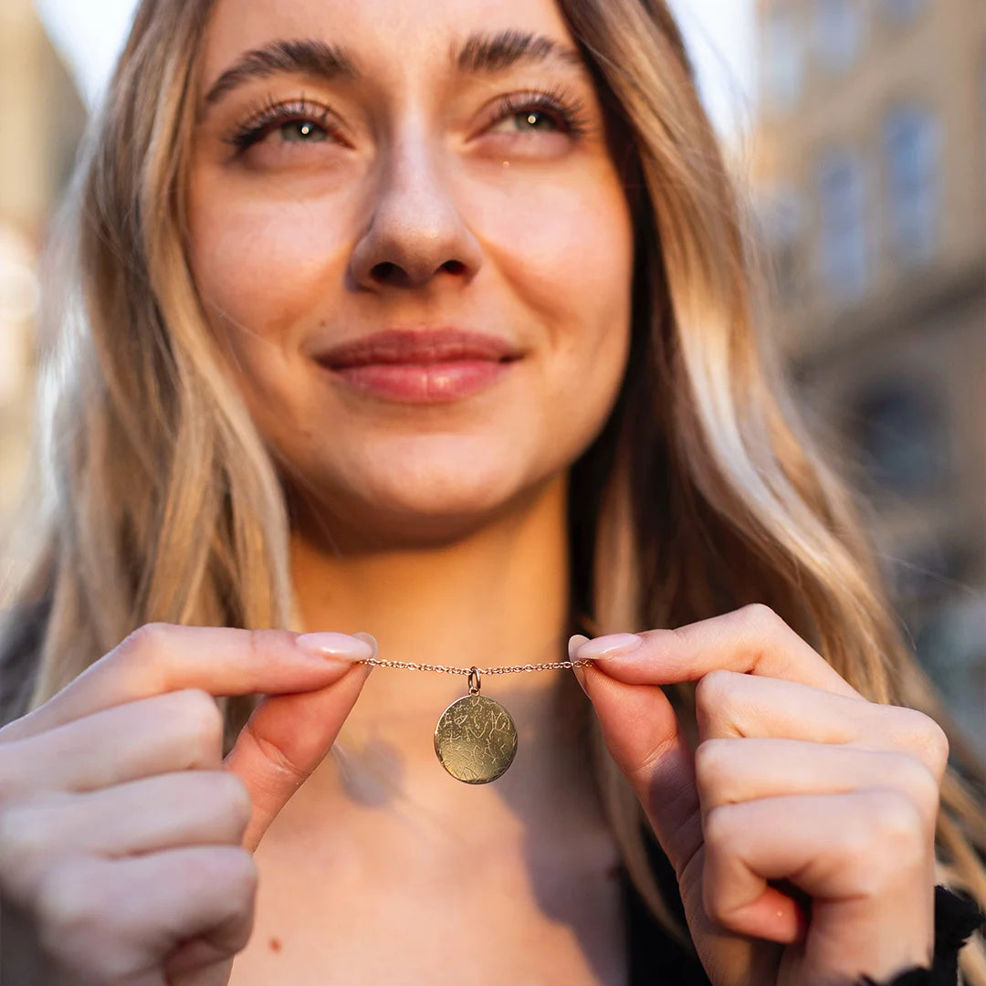 Der Himmel eines Sternmoments – verewigt in einer einzigartigen Halskette mit persönlicher Gravur von Namen, Datum, Ort und Sternzeichen.